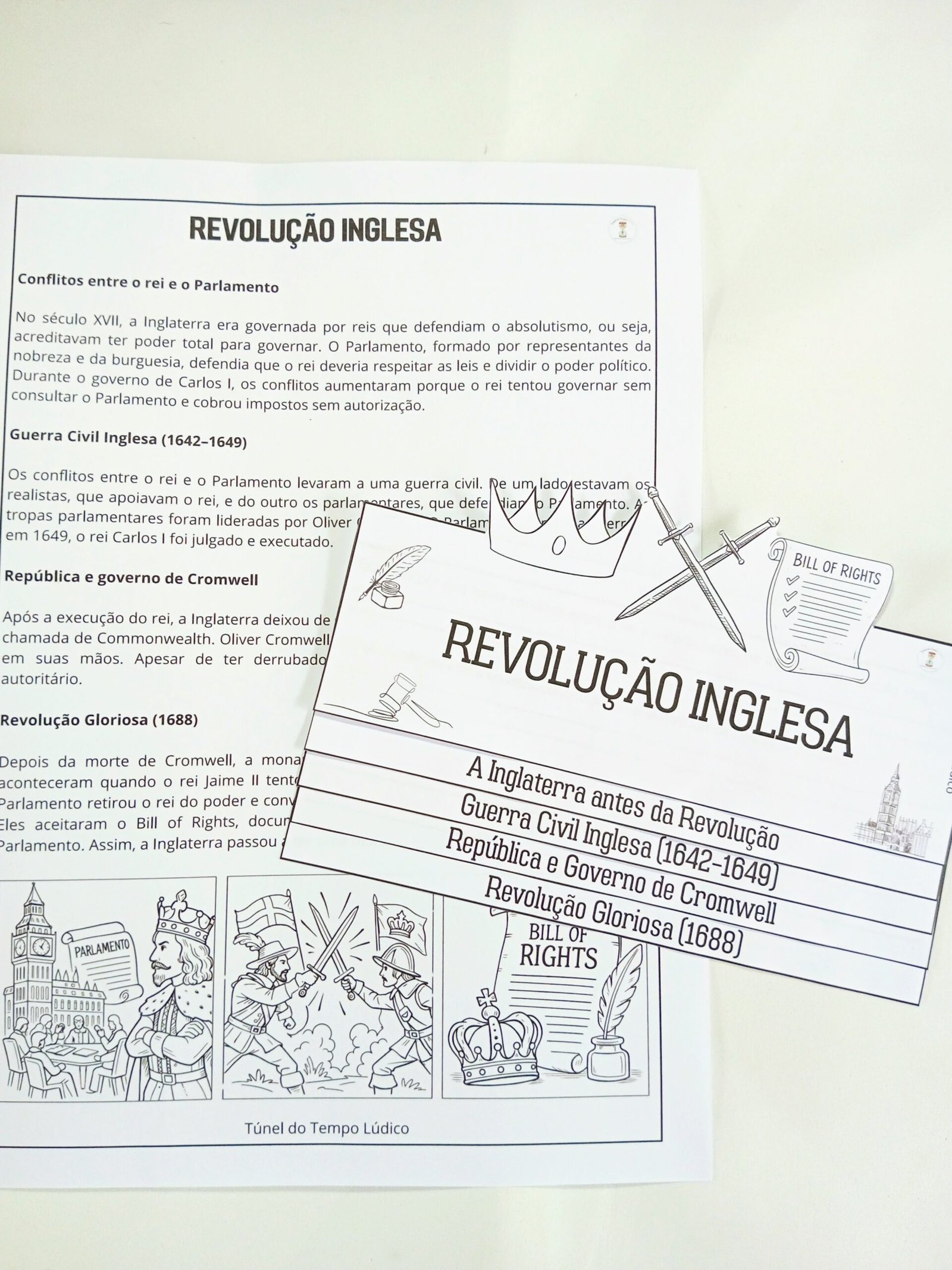 A atividade Revolução Inglesa foi desenvolvida para trabalhar de forma clara e organizada um dos principais acontecimentos da História Moderna com alunos do 8º ano do Ensino Fundamental. O material apresenta o conteúdo dividido em fases históricas, facilitando a compreensão dos principais eventos, personagens e transformações políticas ocorridas na Inglaterra no século XVII.